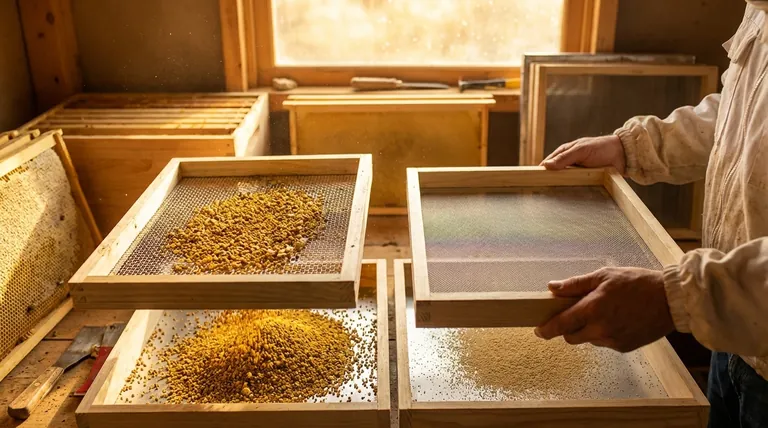 Imaginez un apiculteur commercial après une récolte de pollen réussie. Le produit brut est précieux mais mélangé à de petits débris de la ruche. Pour créer un produit propre et commercialisable, il doit être tamisé.